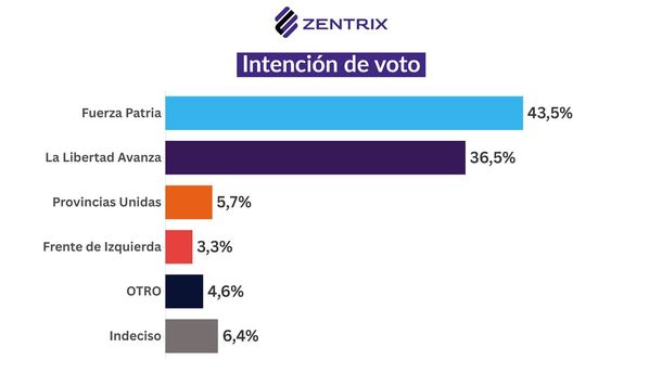 Entre los votantes de Milei, el 38,2% lo valora positivamente frente a un 24,8% que lo rechaza, mientras que entre los votantes de Massa predomina un 76,4% de imagen negativa. Intención de voto La intención de voto de cara a las elecciones legislativas del próximo 26 de octubre muestra un crecimiento significativo de Fuerza Patria, que alcanza el 43,5%, es decir un crecimiento de 2 puntos respecto a la medición de septiembre. Por su parte, La Libertad Avanza sube al 36,5%, frente al 35,4% previo.