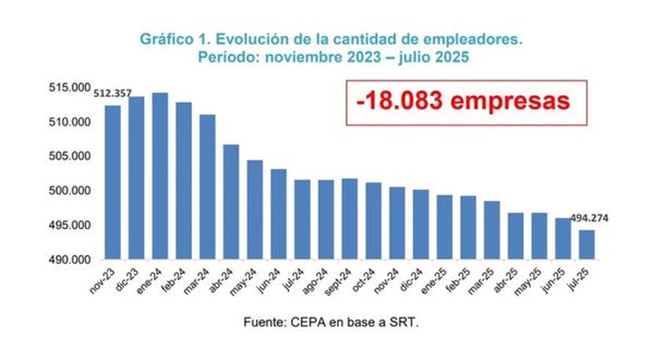 La cantidad de empleadores con personal registrado pasó de 512.357 en noviembre de 2023 a 494.274 en julio de este año, una caída del 3,5%. El impacto de las políticas de Milei fue especialmente fuerte en las pequeñas y medianas empresas, que explican el 99,6% del total de las bajas.