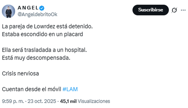 Seguidamente, el periodista indicó: «Ella será trasladada a un hospital. Está muy descompensada. Crisis nerviosa», en lo que se cree que fue un cuadro de sobredosis de drogas, aunque aún no se reveló si la cantante las ingirió de manera voluntaria o si fue obligada a consumir por su exnovio.