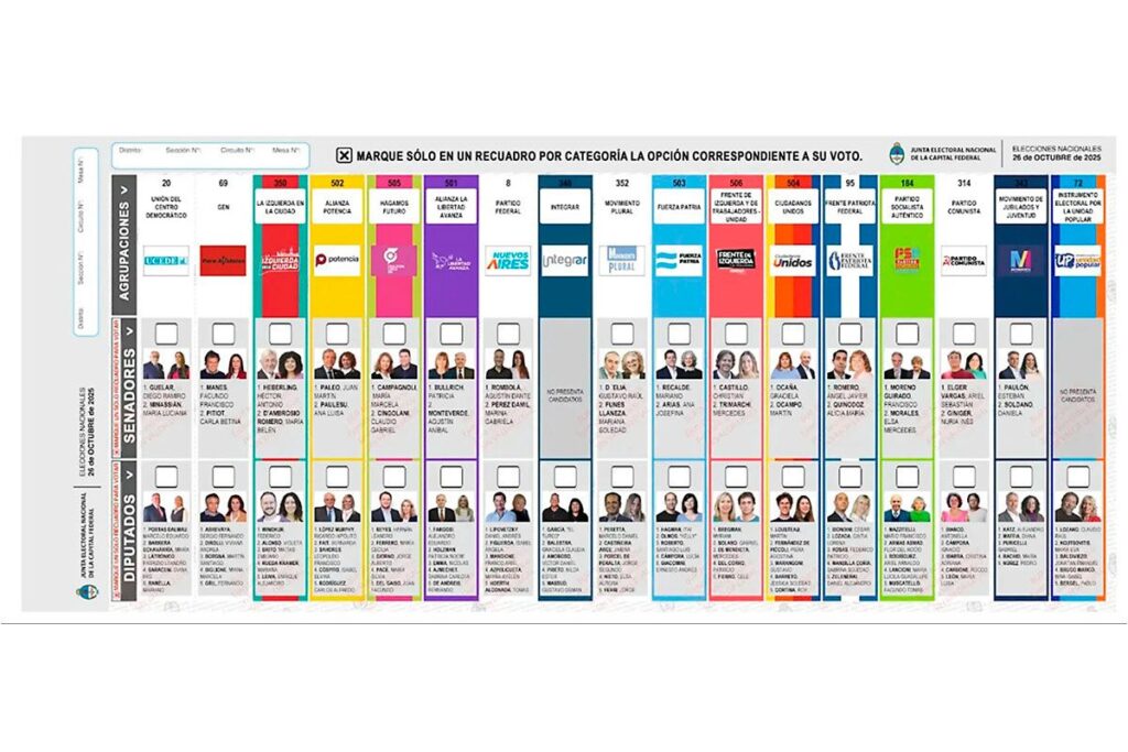 2) Dentro del cuarto oscuro, la persona verá que la boleta consta de columnas de cada partido político (nombre, logo, número de lista) y las filas con las categorías en disputa y las fotos de los dos primeros candidatos de cada categoría. La clave es marcar con birome un sólo recuadro por cada categoría. Por ejemplo: en CABA se eligen diputados y senadores nacionales por lo que habrá que votar en las dos categorías. En Provincia de Buenos Aires, solo se votan diputados nacionales, por lo que la boleta incluirá una sola categoría.