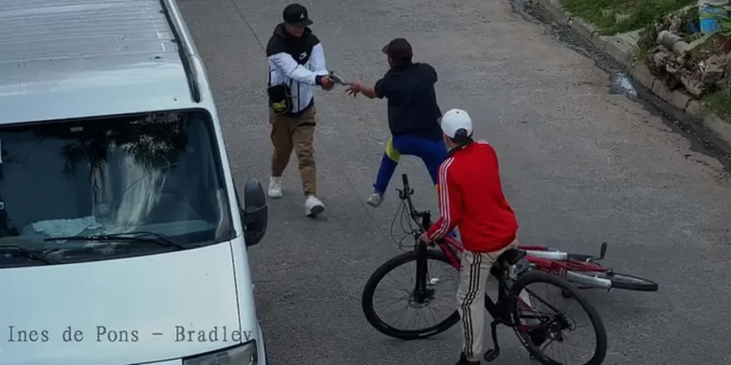 En el video se observa que los tres hombres venían hablando normalmente, cuando Sebastián sacó el arma de su morral y le disparó a la víctima que estaba por llegar a su casa. Diego saltó de la bicicleta e intentó retener al agresor para que no le disparara nuevamente.