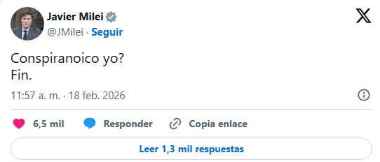 “Conspiranoico yo? Fin”, fue el mensaje que el mandatario difundió en la red social X, sin dar mayores explicaciones. Se puede inferir que interpreta como una conspiración una medida de fuerza de la CGT en contra del retroceso en materia de derecho laboral.